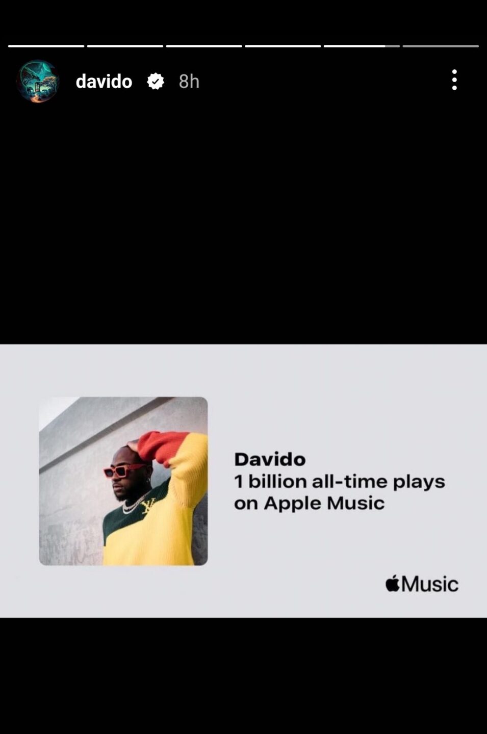Renowned singer and performer Davido is on a remarkable journey of artistic growth and achievement. Recently, he achieved a significant milestone by surpassing one billion career streams on Apple Music, placing him among the elite artists to accomplish this feat.