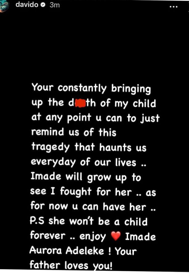 “You’re constantly bringing up the death of my child at any point you can to just remind us of this tragedy that haunts us every day of our lives. Imade will grow up to see I fought for her. As for now, you can have her. P.S she won’t be a child forever. Enjoy Imade Aurora Adeleke! Your father loves you!”