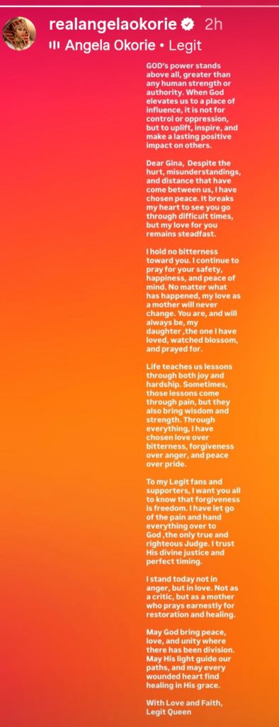 Taking to her social media page, Angela shared a heartfelt message calling for fairness, compassion, and forgiveness, saying that positions of power should never be used to oppress others.