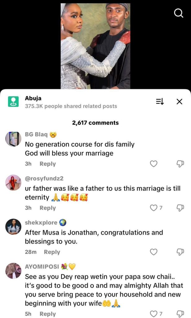 As photos and videos from the wedding began circulating online, people from different parts of the country flooded the comment sections with prayers and goodwill messages. Many praised the late Yar’adua, calling him the “best President” Nigeria ever had, and expressed hope that his legacy would bring blessings to his son’s new home.