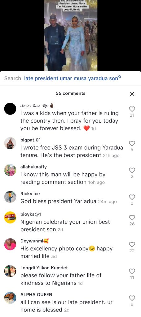 As photos and videos from the wedding began circulating online, people from different parts of the country flooded the comment sections with prayers and goodwill messages. Many praised the late Yar’adua, calling him the “best President” Nigeria ever had, and expressed hope that his legacy would bring blessings to his son’s new home.