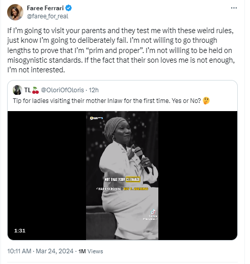 In response to Adejumo’s teachings, a Twitter user identified as @faree_for_real expressed her reluctance to conform to what she deemed as “weird rules” set by her partner’s family. She stated her unwillingness to adhere to “misogynistic standards,” emphasizing that her partner’s love should suffice without the need for excessive demonstrations of propriety.